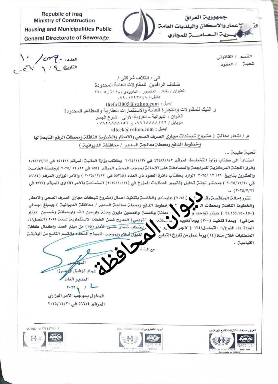 - بعد إكمال التعارضات، محافظ الديوانية: المباشرة بأعمال المقطع الأخير لشارع آل خليفة