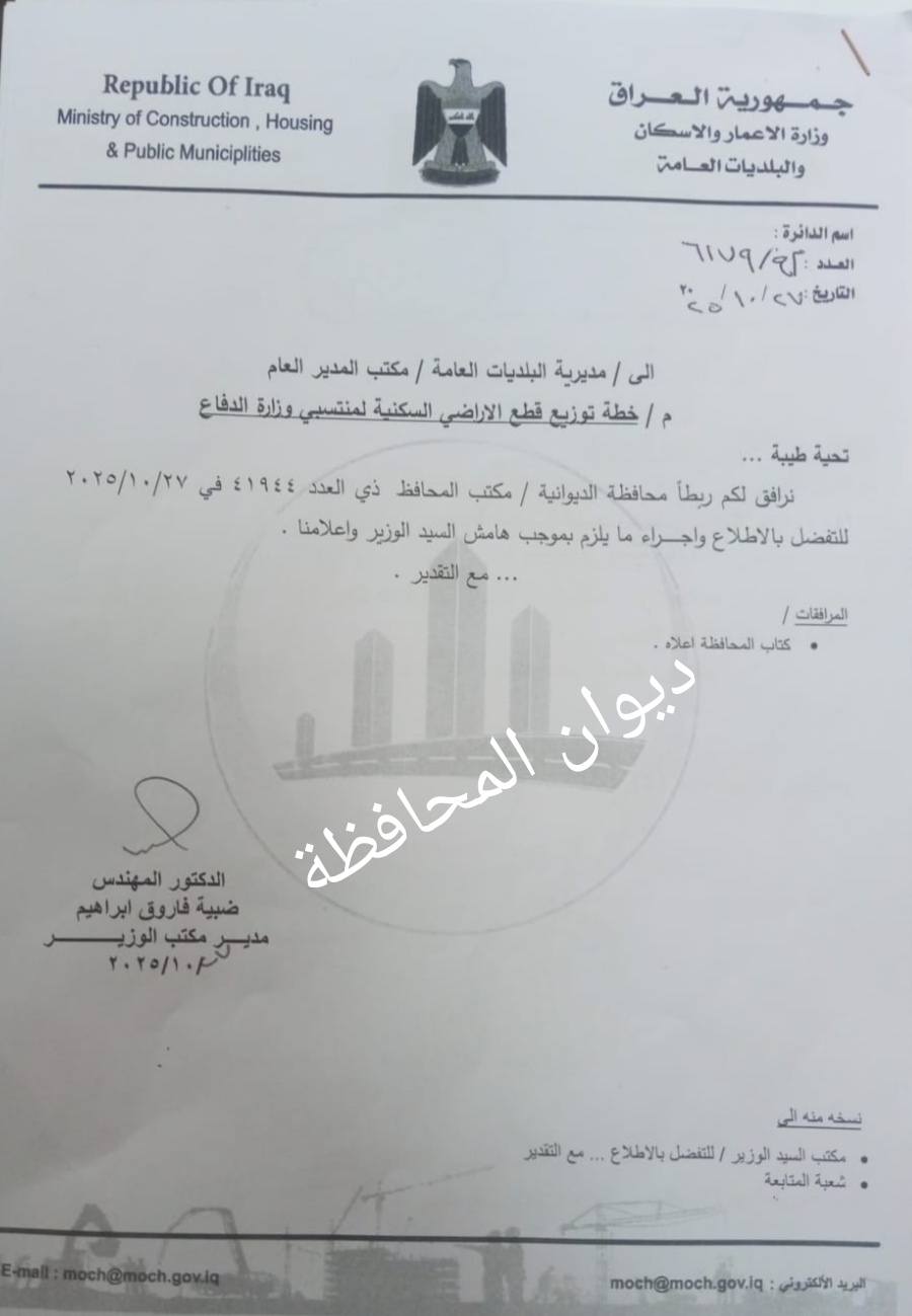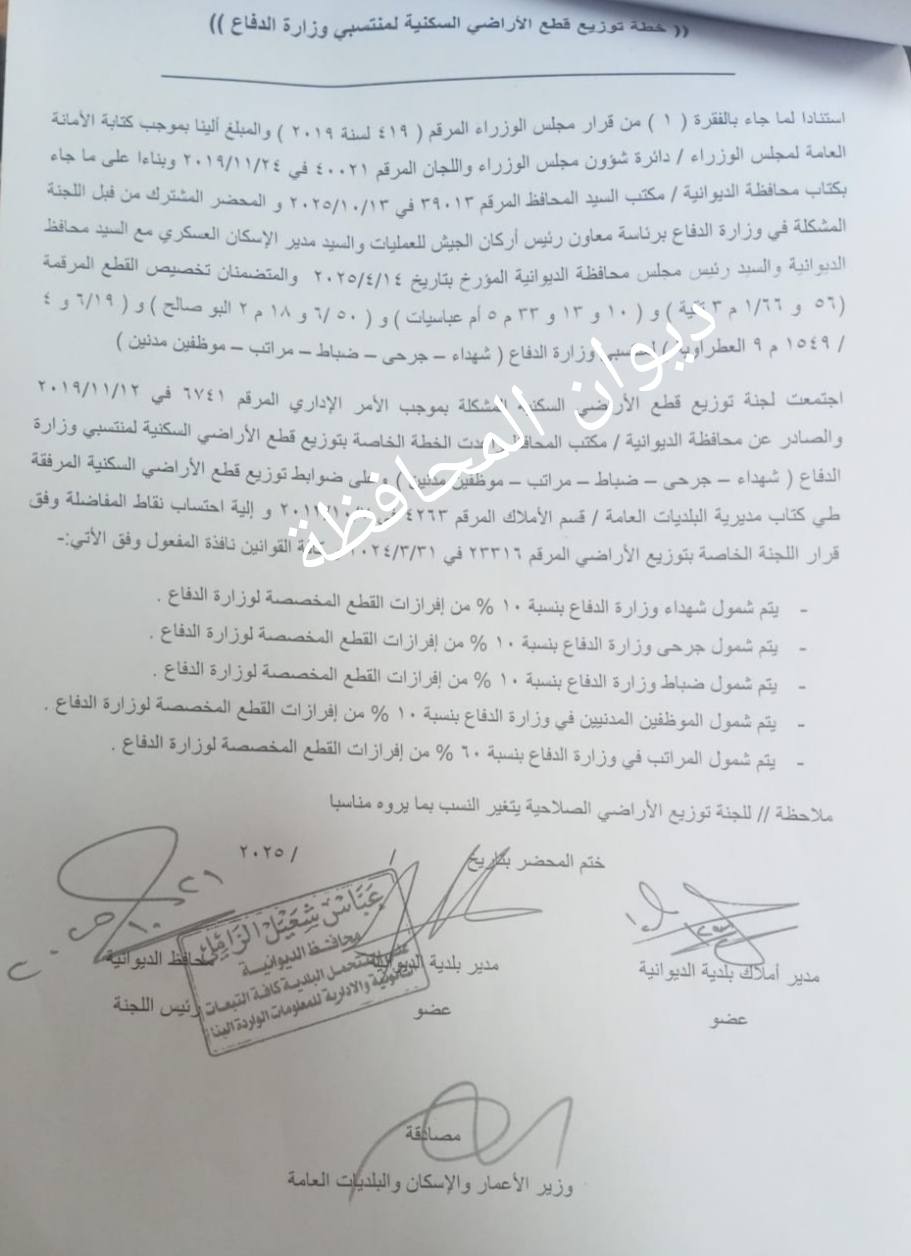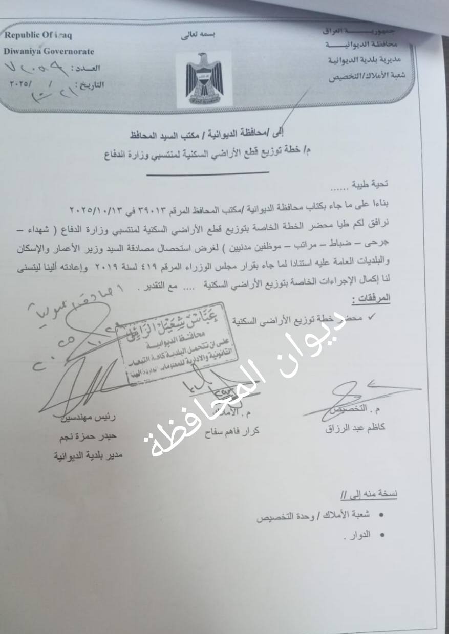 بالوثائق : محافظ الديوانية يعلن مصادقة وزير الإعمار والإسكان والبلديات العامة على خطة توزيع قطع الأراضي السكنية لمنتسبي وزارة الدفاع