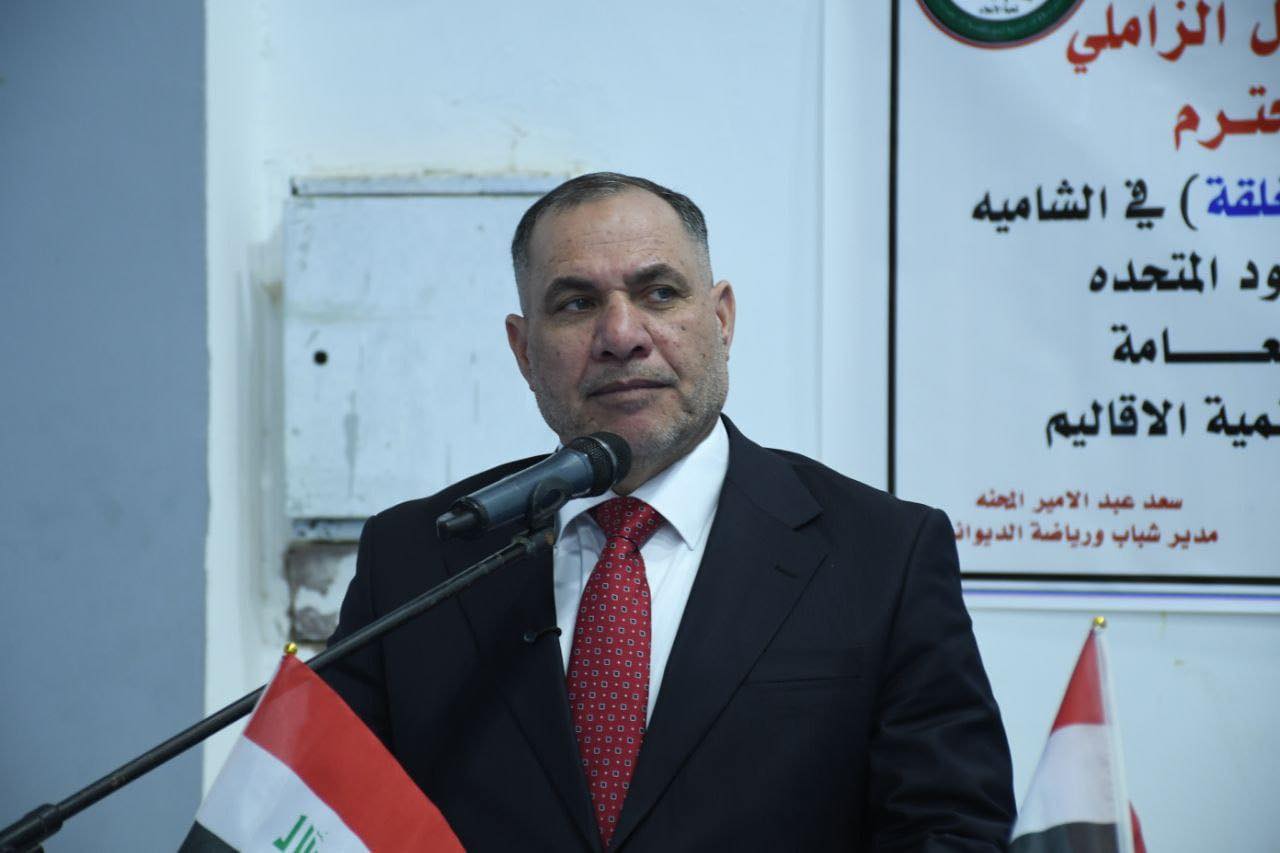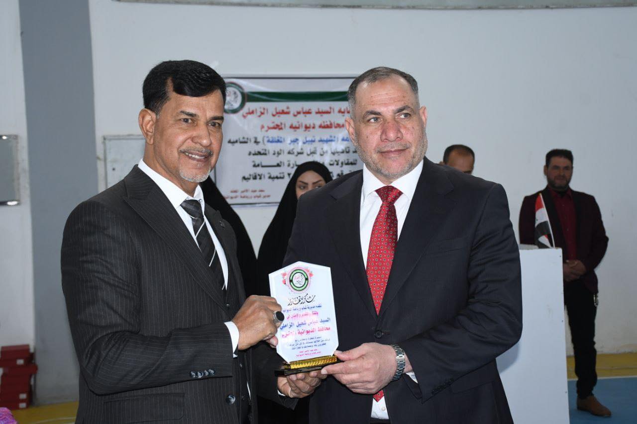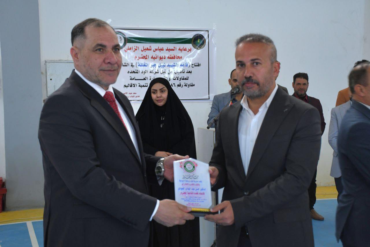 محافظ الديوانية يفتتح قاعة الشهيد “نبيل جبر” المغلقة متعددة الأغراض في قضاء الشامية، ضمن مشاريع تنمية الأقاليم.