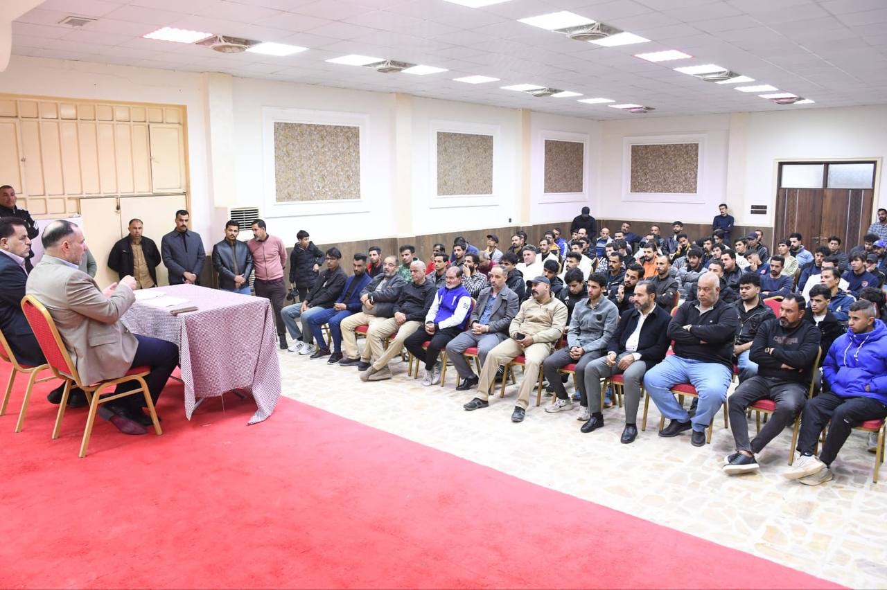 محافظ الديوانية يعقد اجتماعًا موسعًا مع مجلس الفرق الشعبية في منتدى شباب الأسكان لمناقشة المشاكل والمعوقات التي تواجه الأعمال في ملاعب النهروان والرواد