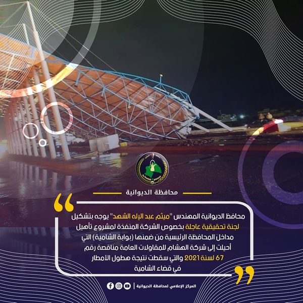 محافظ الديوانية المهندس “ميثم عبد الإله الشهد” يوجه بتشكيل لجنة تحقيقية عاجلة بخصوص الشركة المنفذة لمشروع تأهيل مداخل المحافظة الرئيسية من ضمنها (بوابة الشامية) التي أحيلت إلى شركة الهشام للمقاولات العامة مناقصة رقم 67 لسنة 2021 والتي سقطت نتيجة هطول الأمطار في قضاء الشامية.