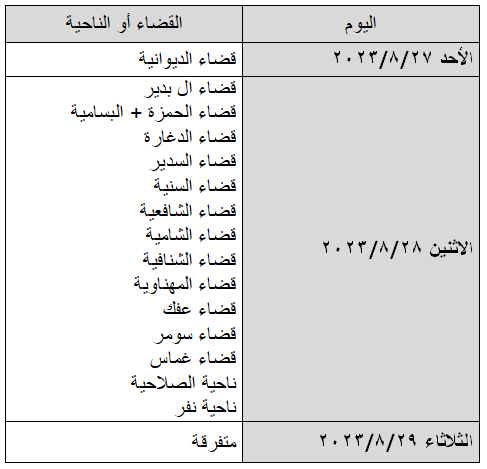 ويكون تقديم المستمسكات واستلام المعاملات للمرشحين في ديوان المحافظة – قسم الموارد البشرية و حسب الجدول أدناه