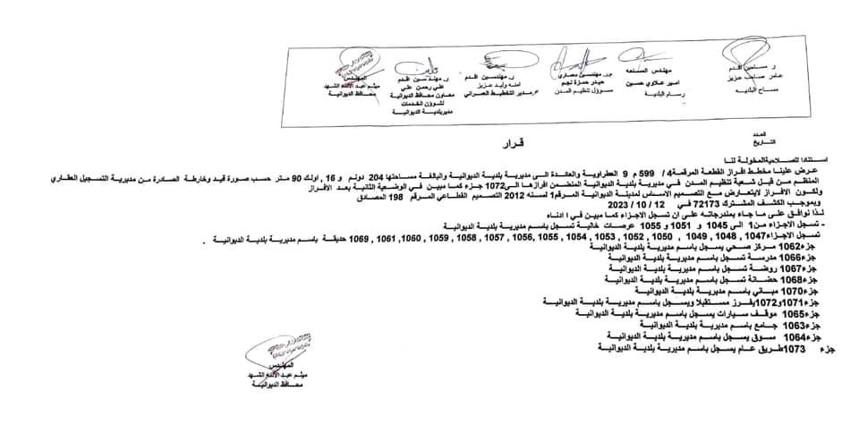 محافظ الديوانية المهندس “ميثم عبد الإله الشهد” يصادق على الخريطة الافرازية لمقاطعة 599/4 عطراوية لتوزيعها على شريحة شهداء وجرحى القوات الأمنية
