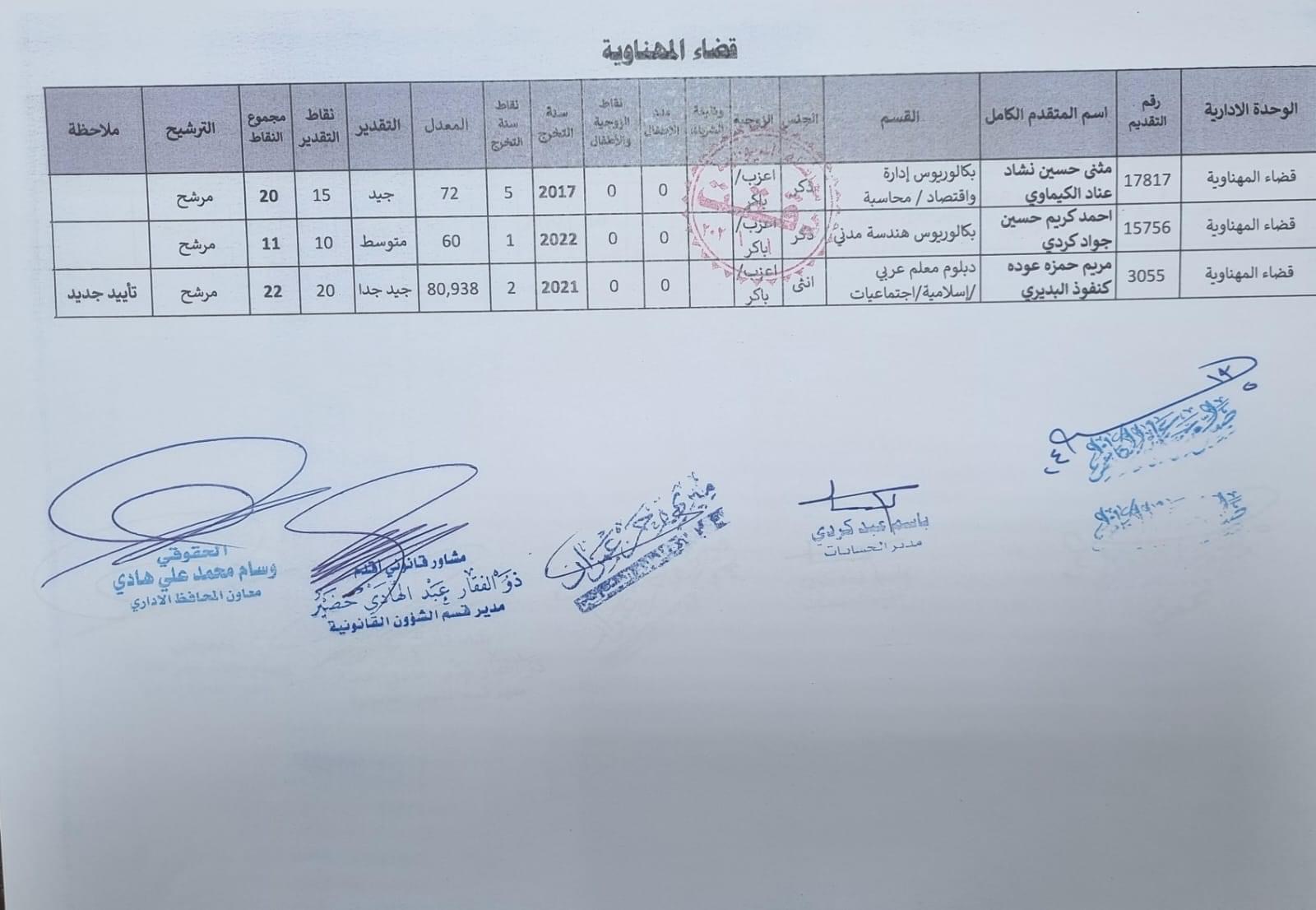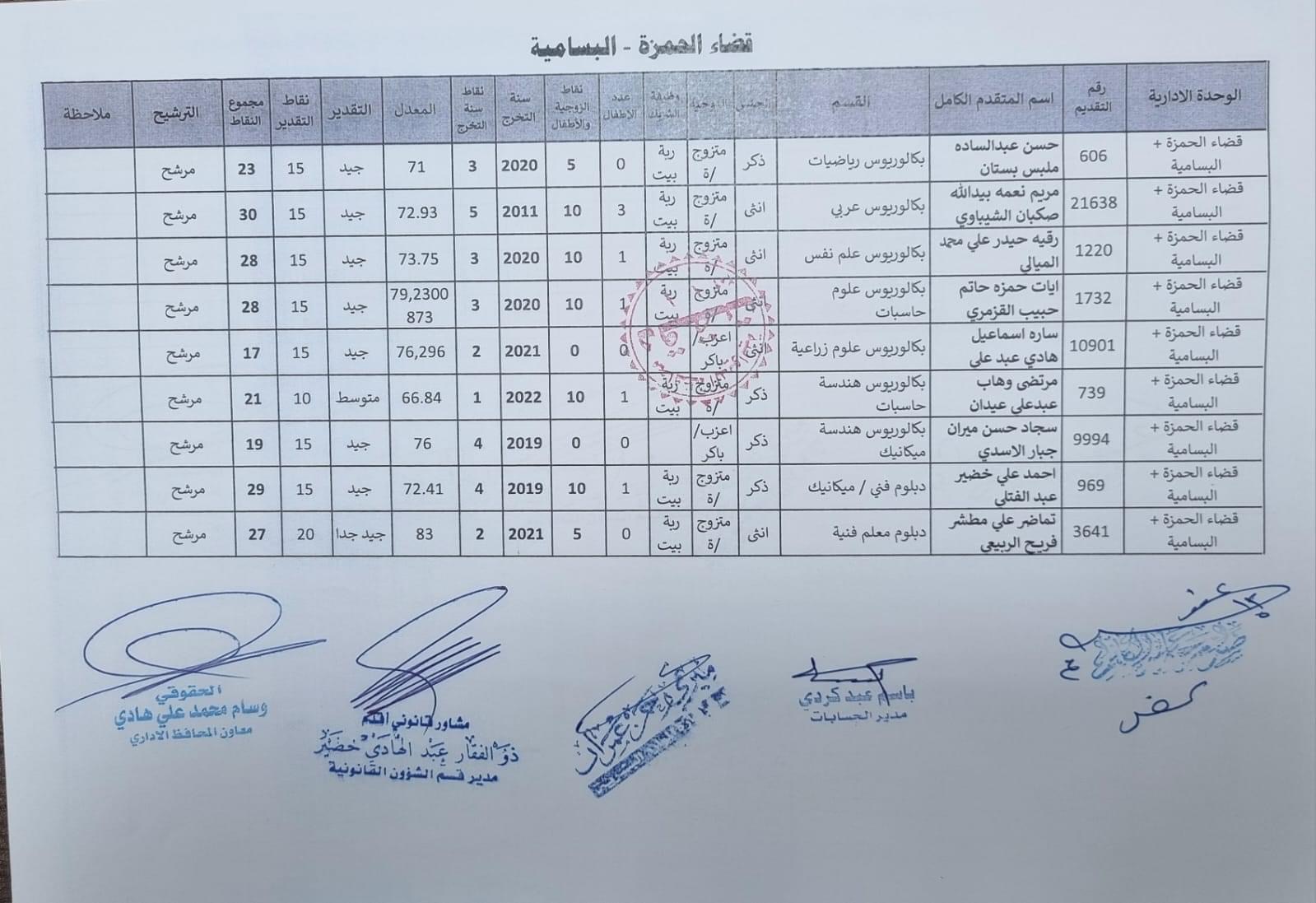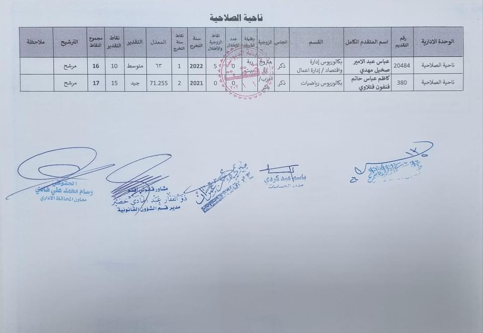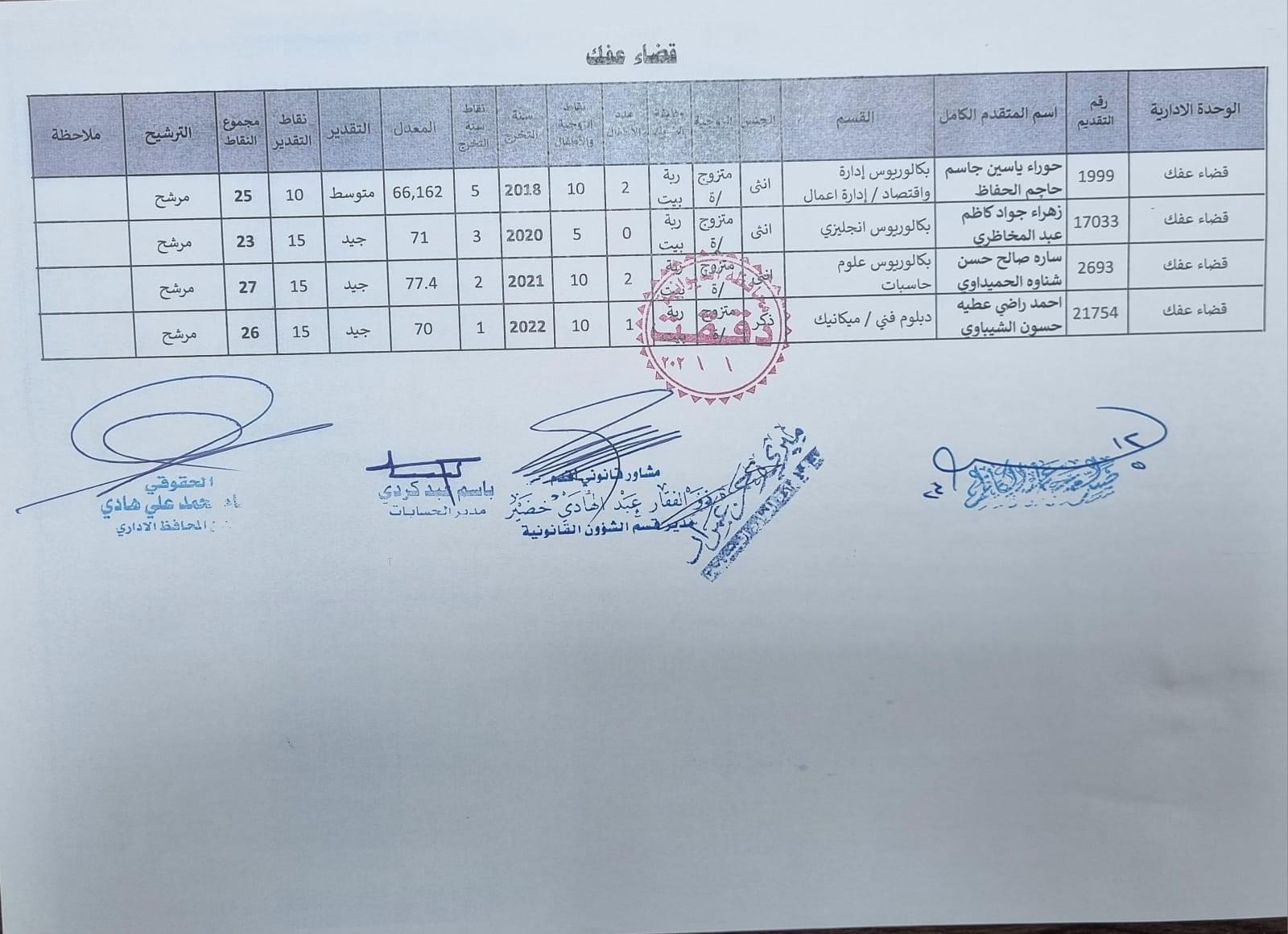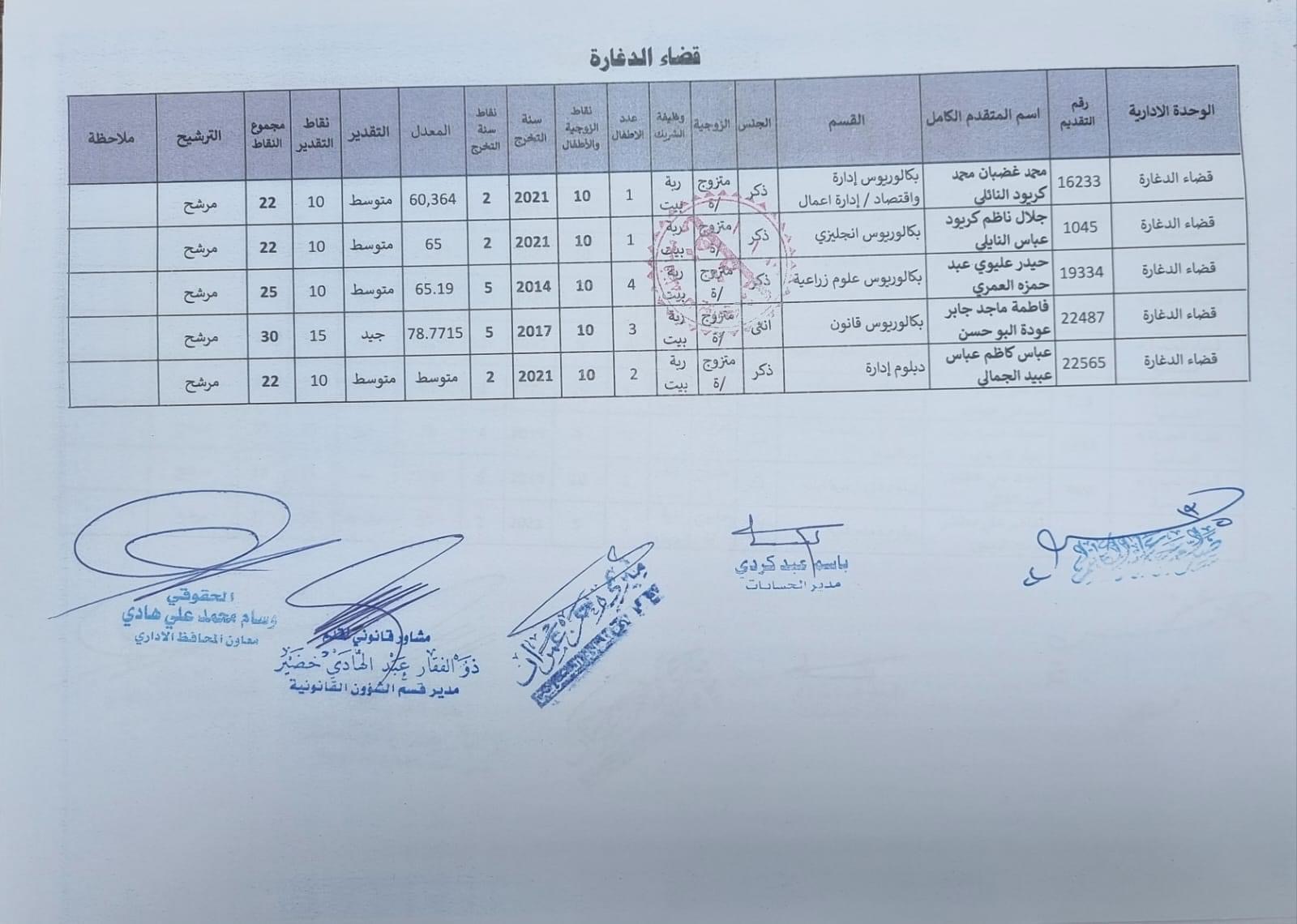 على السادة المدرجة اسمائهم أدناه ، الذين ظهرت أسمائهم بصفة عقد (1000) درجة ضمن قانون الامن الغذائي والتنمية / الوجبة الخامسة ، مراجعة ديوان المحافظة / قسم الادارة العامة ابتدأ من يوم غد الثلاثاء المصادف 2024/5/21 ولغاية نهاية الدوام الرسمي ليوم الخميس المصادف 2024/5/23 لغرض إكمال إجراءات المقابلة، بعد جلب المستمسكات الأصولية مع وثيقة التخرج وتأييد من المجلس المحلي.