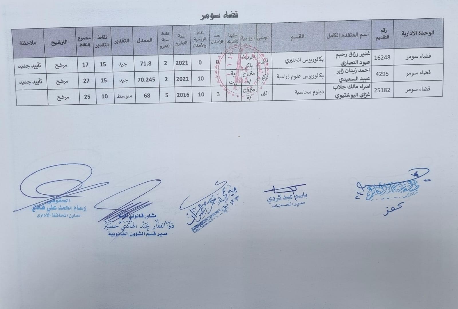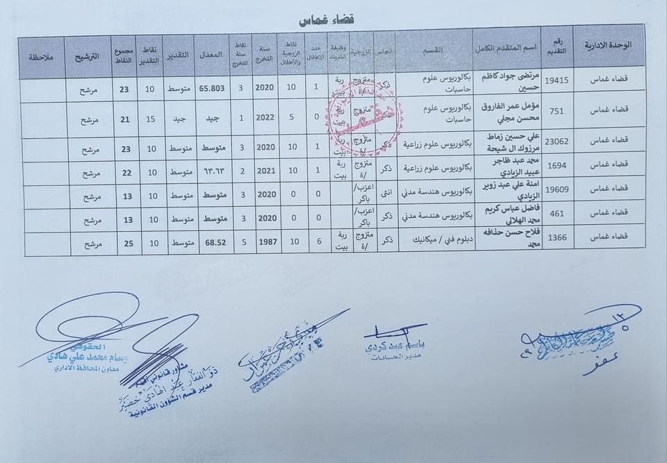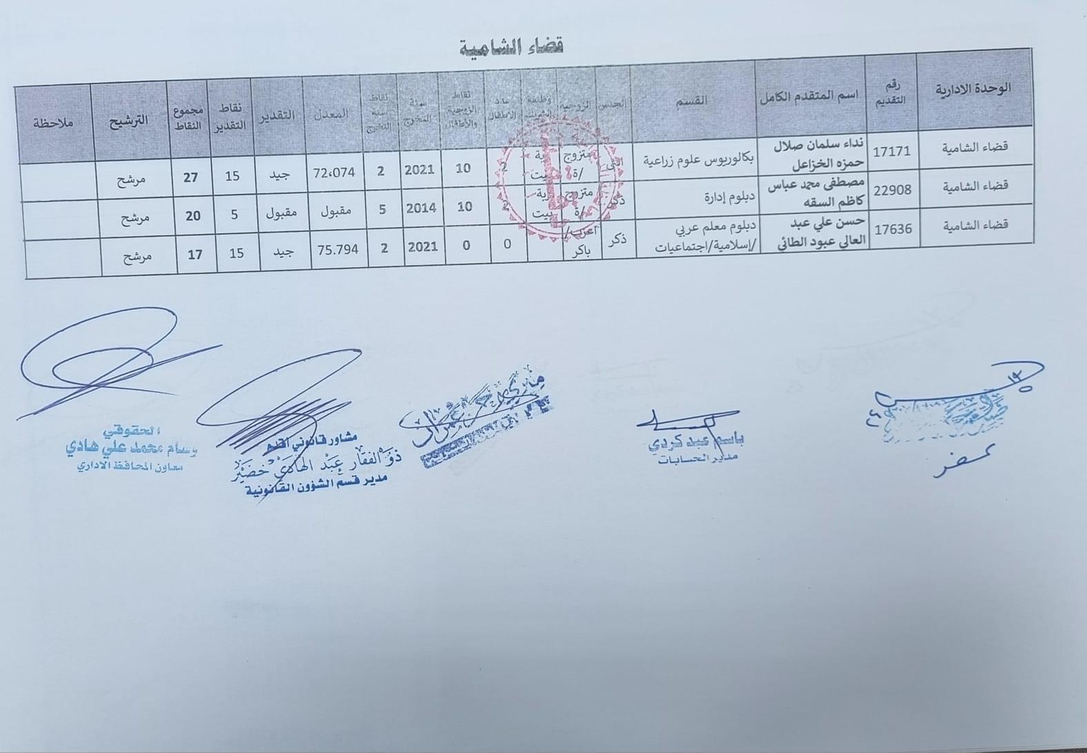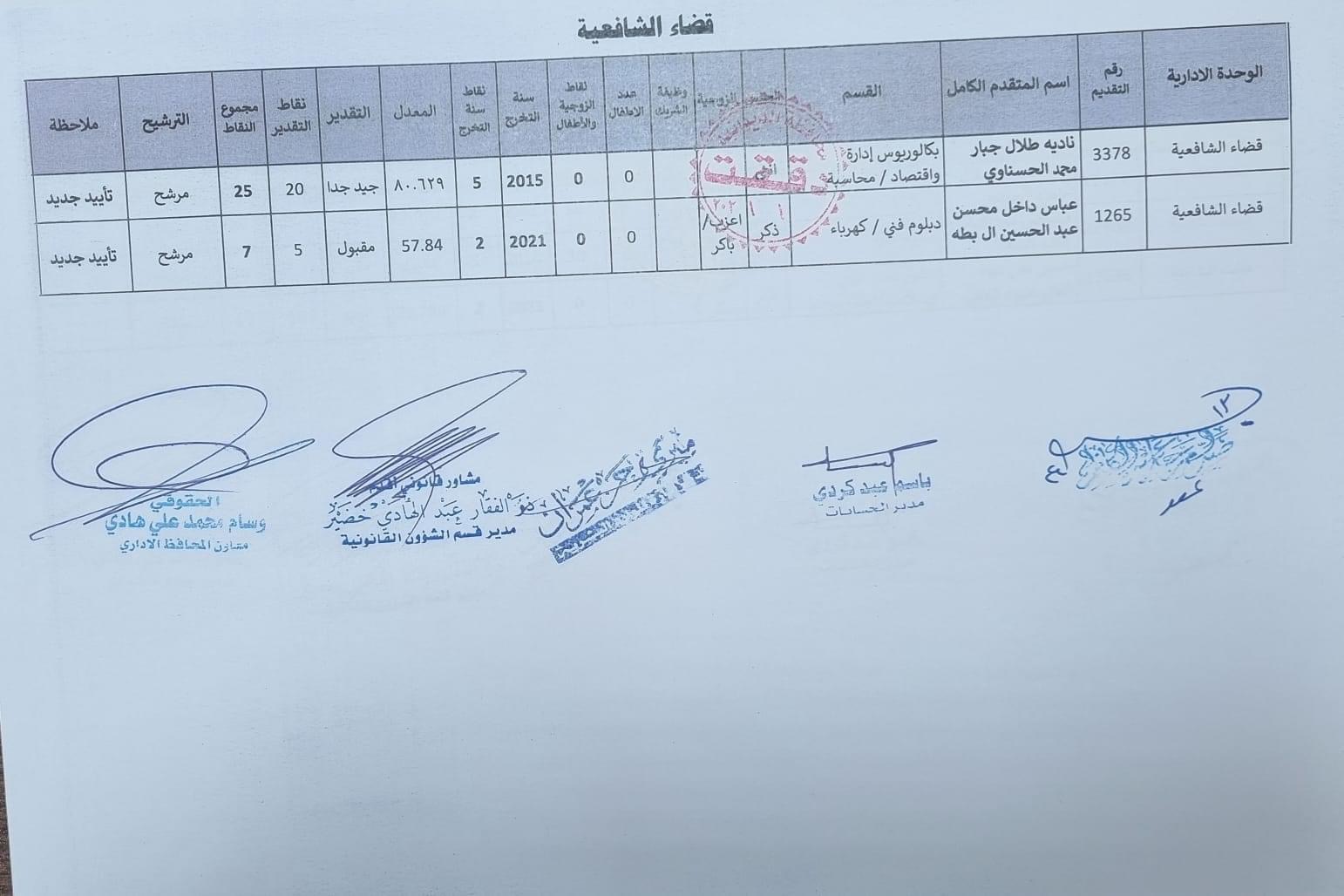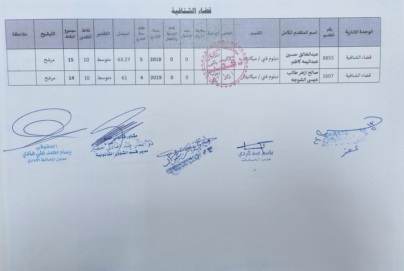 على السادة المدرجة اسمائهم أدناه ، الذين ظهرت أسمائهم بصفة عقد (1000) درجة ضمن قانون الامن الغذائي والتنمية / الوجبة الخامسة ، مراجعة ديوان المحافظة / قسم الادارة العامة ابتدأ من يوم غد الثلاثاء المصادف 2024/5/21 ولغاية نهاية الدوام الرسمي ليوم الخميس المصادف 2024/5/23 لغرض إكمال إجراءات المقابلة، بعد جلب المستمسكات الأصولية مع وثيقة التخرج وتأييد من المجلس المحلي.