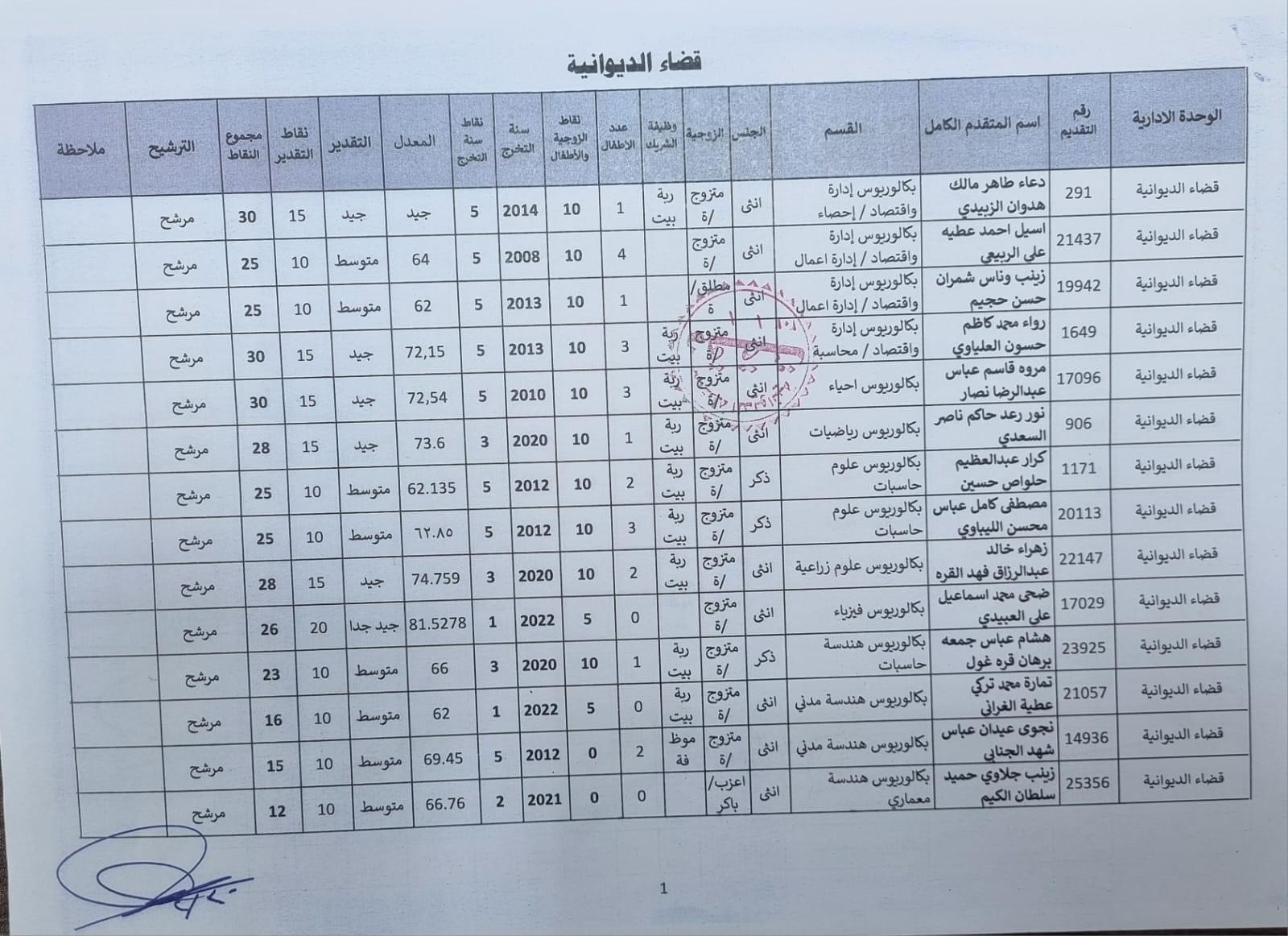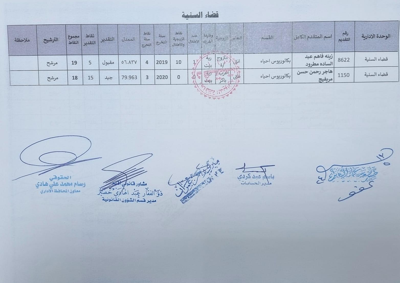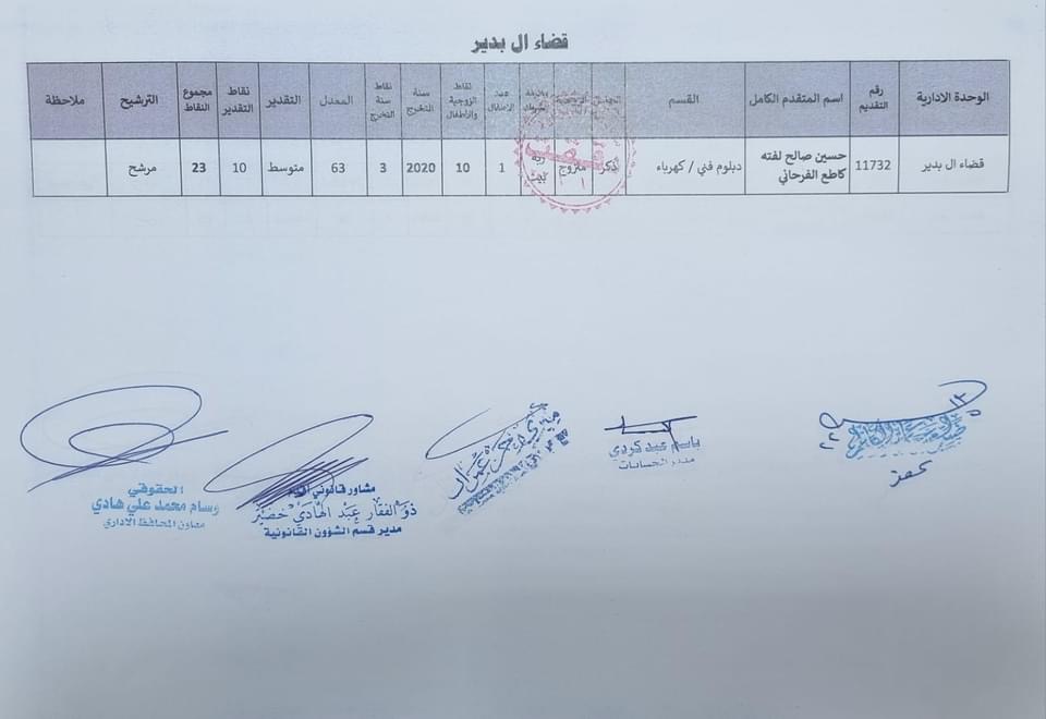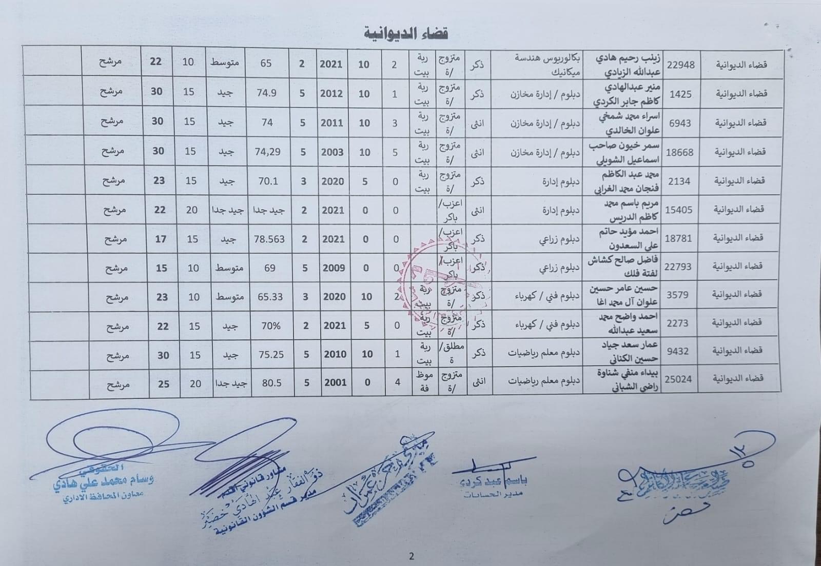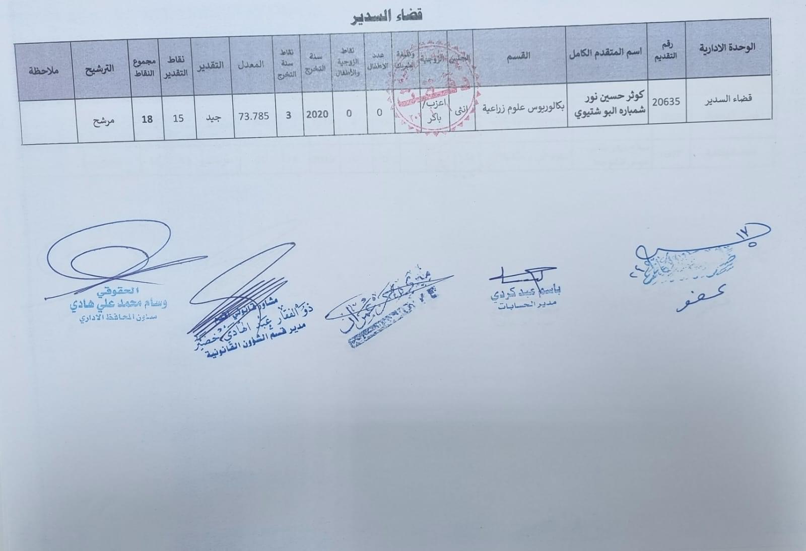 على السادة المدرجة اسمائهم أدناه ، الذين ظهرت أسمائهم بصفة عقد (1000) درجة ضمن قانون الامن الغذائي والتنمية / الوجبة الخامسة ، مراجعة ديوان المحافظة / قسم الادارة العامة ابتدأ من يوم غد الثلاثاء المصادف 2024/5/21 ولغاية نهاية الدوام الرسمي ليوم الخميس المصادف 2024/5/23 لغرض إكمال إجراءات المقابلة، بعد جلب المستمسكات الأصولية مع وثيقة التخرج وتأييد من المجلس المحلي.