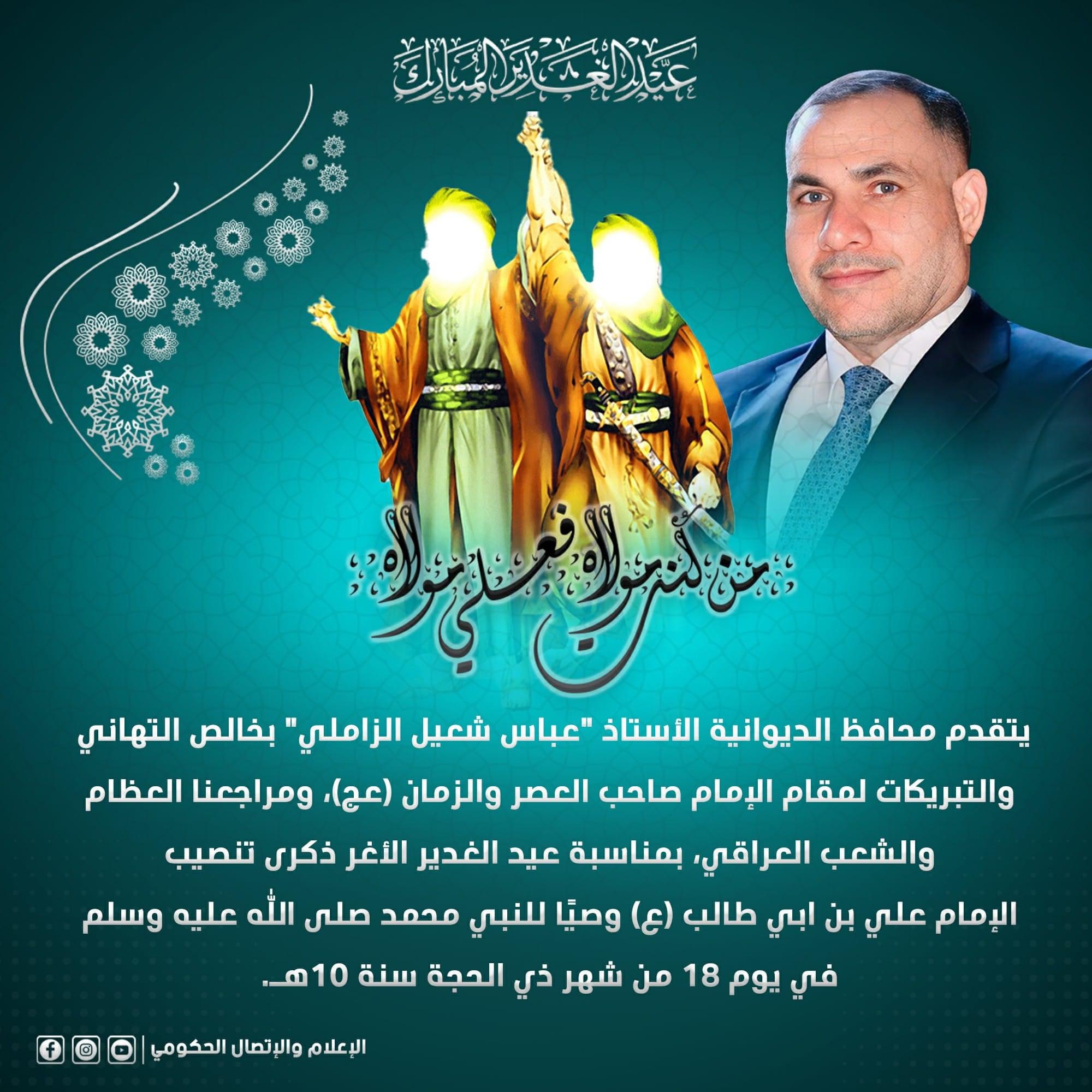 (من كنت مولاه فهذا علي مولاه) يتقدم محافظ الديوانية الأستاذ "عباس شعيل الزاملي" بخالص التهاني والتبريكات لمقام الإمام صاحب العصر والزمان (عج)، ومراجعنا العظام والشعب العراقي، بمناسبة عيد الغدير الأغر ذكرى تنصيب الإمام علي بن ابي طالب (ع) وصيًا للنبي محمد صلى الله عليه وسلم...