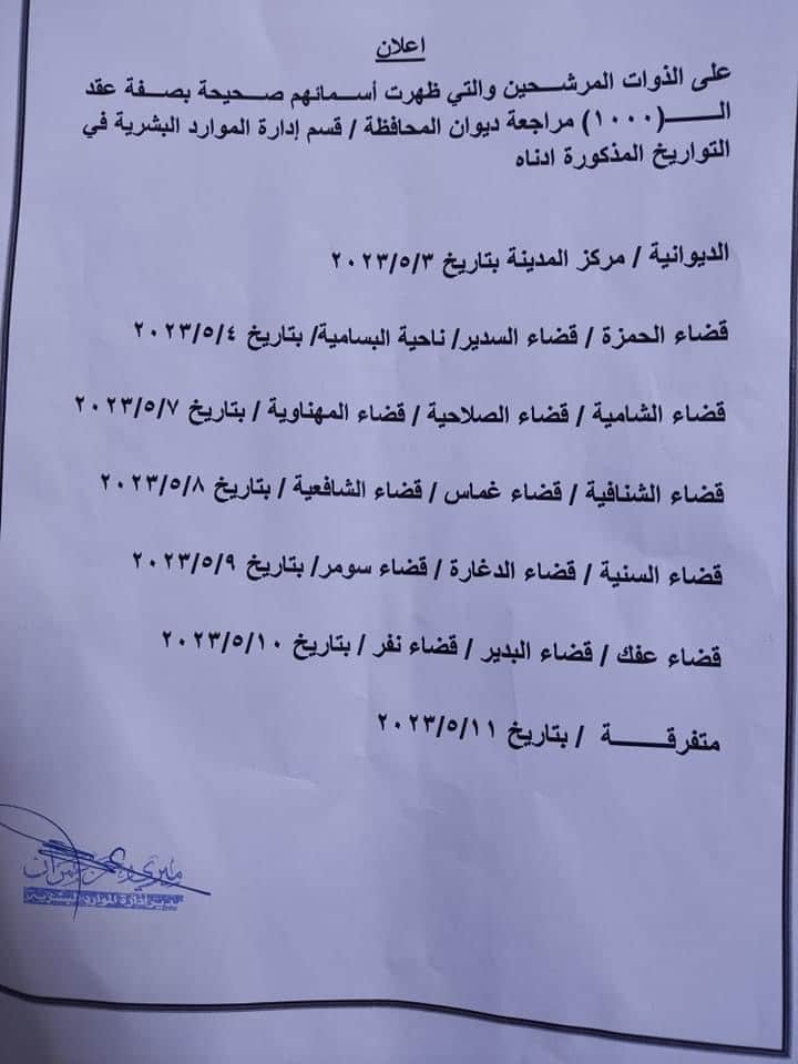 تعلن محافظة الديوانية عن الأسماء المرشحة (الاحتياط) لغرض التعيين بصفة عقد مؤقت ولمدة ثلاث سنوات على الدرجات الخاصة ضمن قانون الأمن الغذائي (1000) درجة في مركز المحافظة والوحدات الإدارية ، بعد إكمال تدقيق المعاملات حسب معايير المفاضلة الواردة إلينا في كتاب وزارة المالية ....