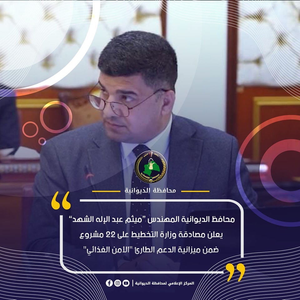 كشف محافظ الديوانية المهندس "ميثم عبد الإله الشهد" عن مصادقة وزارة التخطيط على ٢٢ مشروع ضمن ميزانية الدعم الطارئ " الأمن الغذائي ". وقال الشهد ،أن "أبرز تلك المشاريع تأهيل سبعة أحياء في مركز المحافظة وهي (الفرات ، الصدور الاربعة، الشرطة، الصادق الثاني ) فيما توزعت...